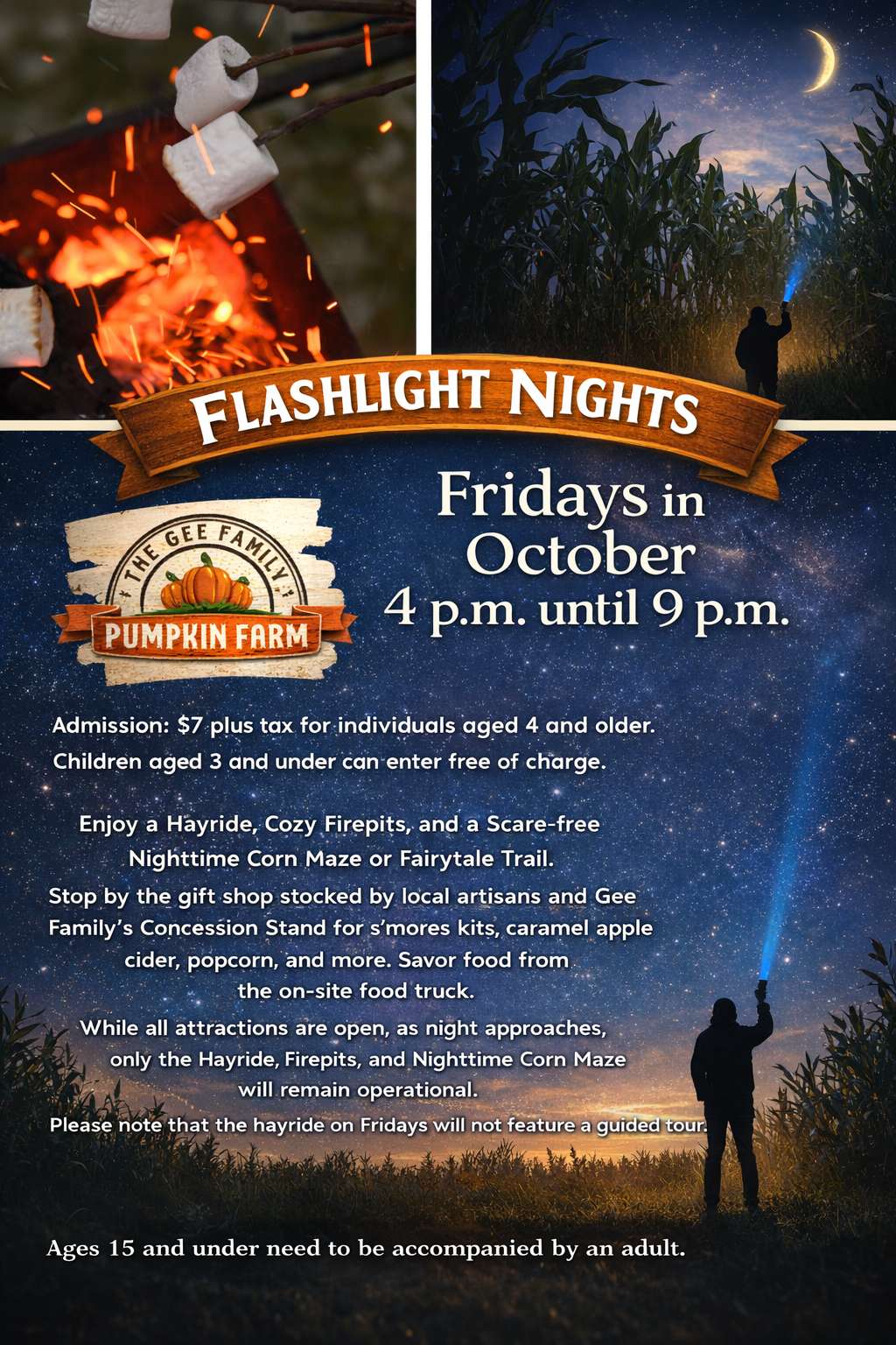 - Enjoy a Hayride, Cozy Firepits, Delicous Popcorn, and a Scare-free Nighttime Cornmaze.